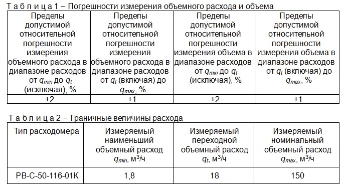 1.2.7 Относительные погрешности измерения объемного расхода и объема в диапазоне расходов от максимального qmax до минимального qmin приведены в таблице 1. Значения переходного qt, минимального qmin и максимального qmax расхода приведены в таблице 2.