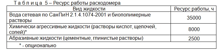 1.2.20 Срок службы расходомера 8 лет, ресурс работы в зависимости от типа жидкости указан в таблице 5.